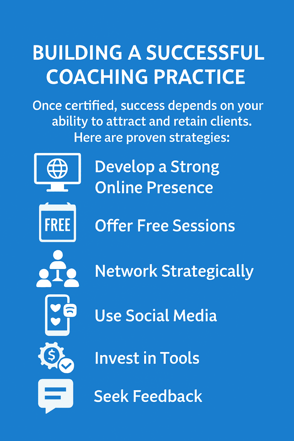 Seek Feedback: Regularly solicit feedback from clients and mentors to refine your coaching approach.